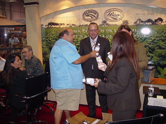 Oh....and by the way, getting back to the three cases of water we were lugging around: we put Padron labels (1964 Anniversary and the regular Padron logo) on bottles in two of the cases as a gift for the hard-working Padron family. Below, Orlando Padron accepts the water from super marketer Joe. We also took the liberty of labeling one case of water bottles with Opus X artwork and presented them to Carlos Fuente Sr. and Jr. which was appreciated greatly by them also.