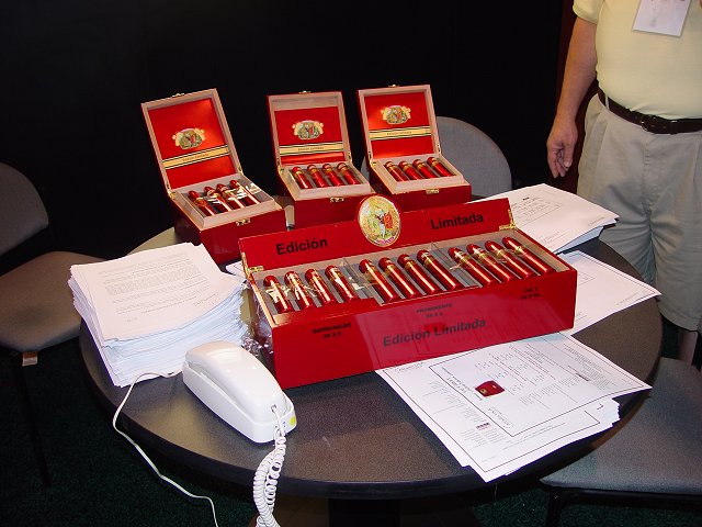 Altadis USA Quintessa - Sporting a beautiful dark Honduran Cubano wrapper, Nicaraguan binder and Honduran and Nicaraguan fillers, this is a very tasty and smooth rich cigar which we already have in the shop. Quintero Maduro - The Quintero was introduced officially at last year's RTDA, although no samples were actually available then. It has since become a go-to smoke in our shop and has a rich, slightly sweet flavor with a pleasant underlying body. The maduro version has a San Andres Morron maduro wrapper and is a very good complement to the natural-wrapped version. Romeo y Julieta Edicion Limitada - We were told that only a select few tobacconists would be shown this cigar which was displayed in a special invitation only room. It is a limited edition cigar which comes in a beautiful red metal tube. This cigar will have a blend unlike any other Romeo...it will have a San Andreas Corojo wrapper, Nicaraguan binder and Nicaraguan and Dominican fillers. No samples were available at the show since they were not through aging. They will be available in 3 sizes all in red metal tubes, Rothchilde 5x54, Prominente 6x54, and No.2 6 1/8x52. Retail will be $17, $18, and $20 respectively. See picture below.